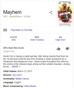When you’ve had a gig as long as Steven Yeun did on The Walking Dead, it’s anybody’s guess what your next project will be. I suppose a film like “The Belko Experiment” where employees go berzerk and massacre each other would be fitting. Well it is and that’s exactly what he stars in and produces with “Mayhem.” Unlike “Walking …” There’s saucy sex involved. Other than that it’s the same because there’s a virus that causes mayhem and killing at a frantic pace.