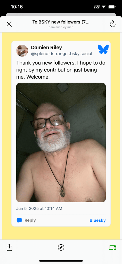 Posted on June 5, 2025June 5, 2025 by Damien RileyTo BSKY new followers (7) https://bsky.app/profile/splendidstranger.bsky.social/post/3lquszmpgo22x Share this: Share on Reddit (Opens in new window) Reddit Share on Tumblr Share on WhatsApp (Opens in new window) WhatsApp Share on Bluesky (Opens in new window) Bluesky Print (Opens in new window) Print Email a link to a friend (Opens in new window) Email Share on Mastodon (Opens in new window) Mastodon Like Loading... Related