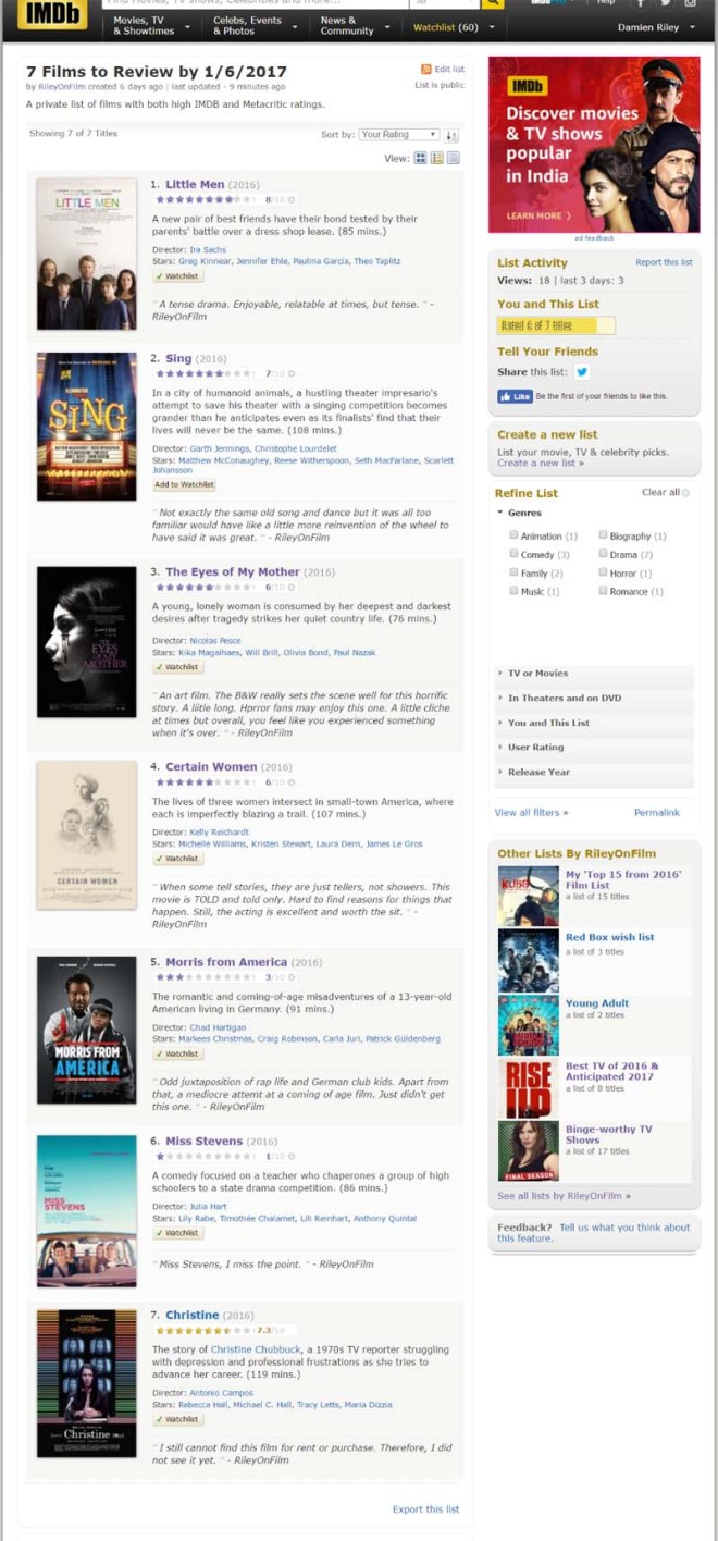 I use IMDB to make lists of films I watch. These are the “Big Fifteen” of 2016 imho. Click on the screenshot below to be taken to my list on IMDB. Happy New Year, see you at the movies.