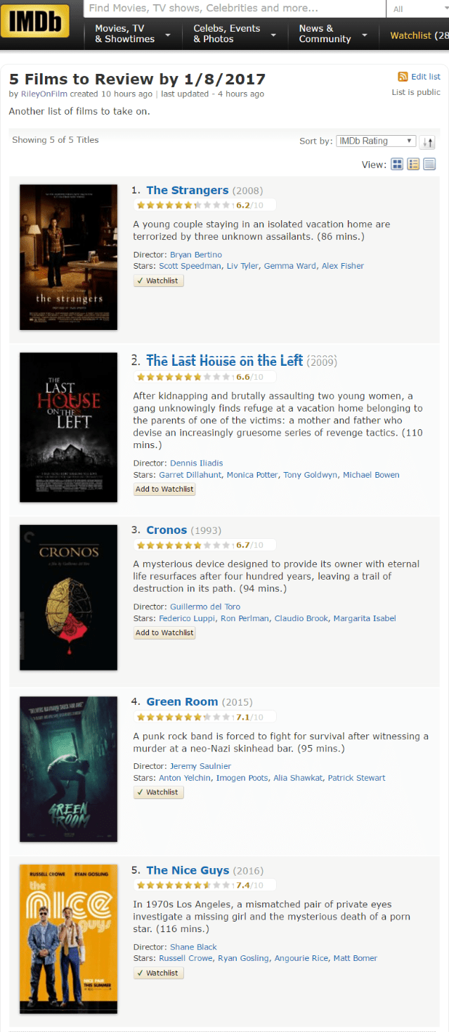 I have one more week of vacation and I intend to review at east these 5 films before I go back to teaching my wonderful students. To comment on my list, you can do so here or click on the image below to be taken to the list on IMDB. I’ll appreciate you comments either place. Thank you in advance.